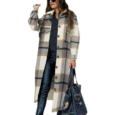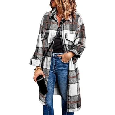 Women's Casual Lapel Button Down Long Plaid Shirt Coat Tartan Shacket Jacket