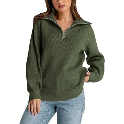 Womens Casual Pullover Sweaters: Fall Winter Trendy Long Sleeve Quarter Zip V Neck Collared Chunky Knit Jumper Tops