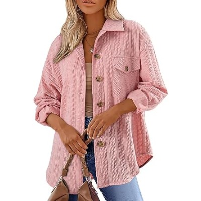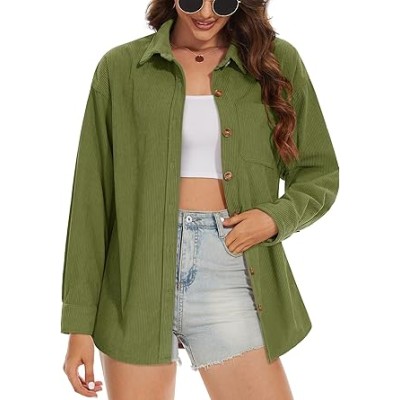 Womens Corduroy Shirt Long Sleeve Oversized Button Up V Neck Blouses Tops Loose Shacket Jacket