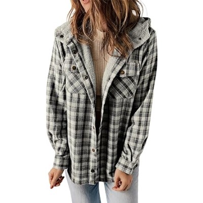 Womens Plaid Shacket Jacket Long Sleeve Button Down Fleece Hooded Jackets Warm Coat