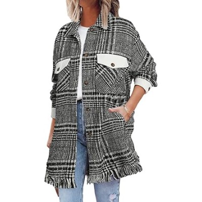 Womens Casual Plaid Shacket Long Sleeve Button Down Oversized Shirt Jacket Coat